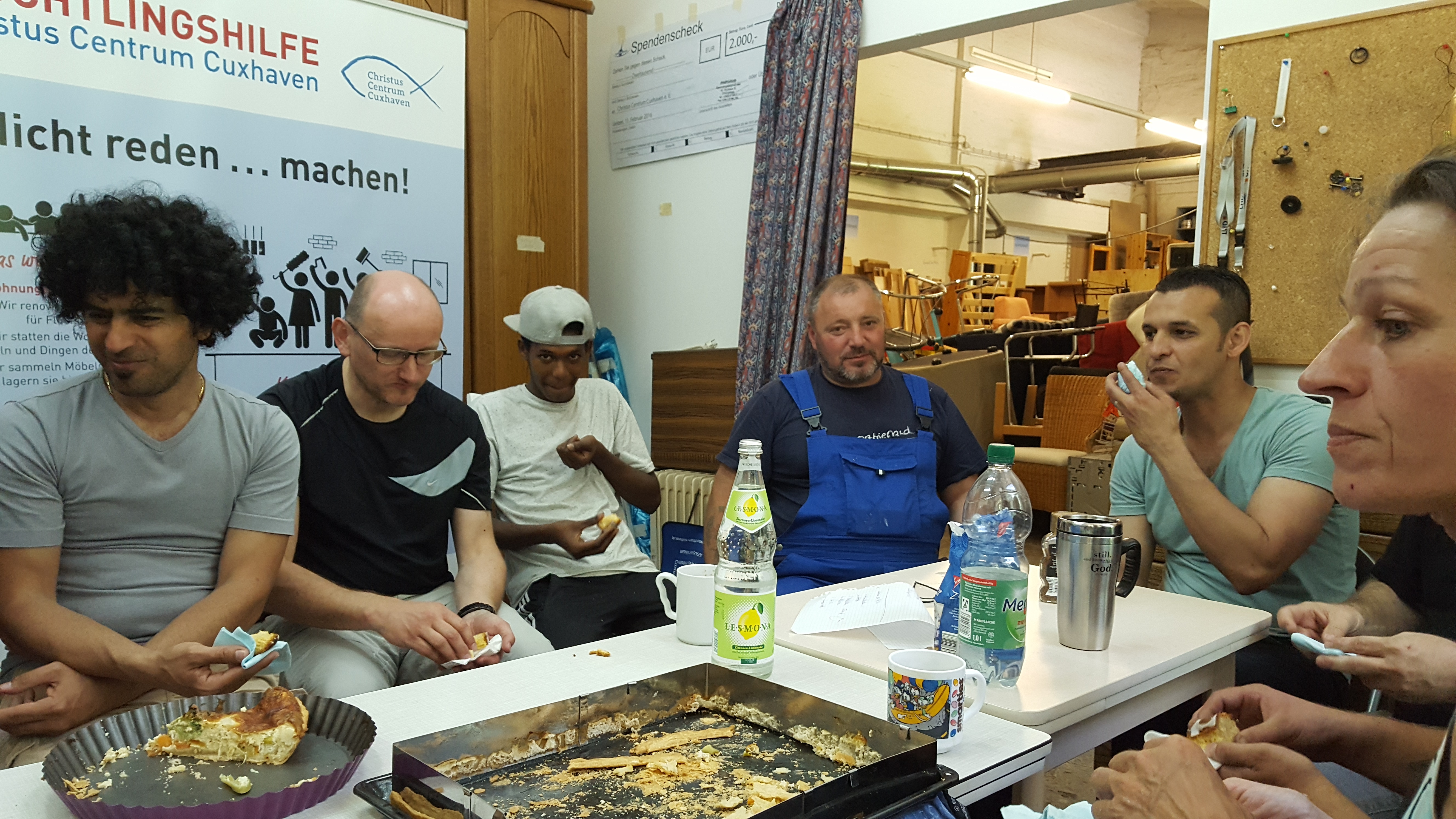 Aus der anfänglichen, ehrlich gesagt recht unprofessionellen Situation haben wir innerhalb eines Jahres eine feste Struktur aufgebaut: Es existiert ein großes Lager, wir holen monatlich mit drei Transportern auf festgelegten Routen Möbel ab. Mittlerweile arbeiten über 20 ehrenamtliche Helfer und einem in Teilzeit Beschäftigten aus unserer Gemeinde, der Stadt Cuxhaven und aus Flüchtlingskreisen mit.