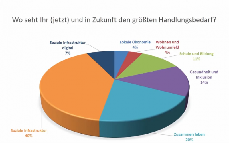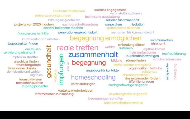 Soziale Infrastruktur und Zusammenleben – das sind die Handlungsfelder, die nach Auskunft der Teilnehmenden an der Umfrage „Folgen der Pandemie in den Quartieren“ jetzt im Fokus stehen und die größten Handlungsbedarfe haben. „Zusammenhalt fördern“, „Spaltung vermeiden“, „Gelegenheit für Austausch“ - nur einige Nennungen, die sichtbar machen, wie sehr in den Quartieren jetzt darum gerungen wird, alle mitzunehmen, die in der Pandemie verschärften Schieflagen und Schicksale aufzufangen. Auch dazu gehört, die Aktivierung für Beteiligung wieder anzuschieben, Lust auf Demokratie und nicht zuletzt die Kommunalwahlen im September zu machen.