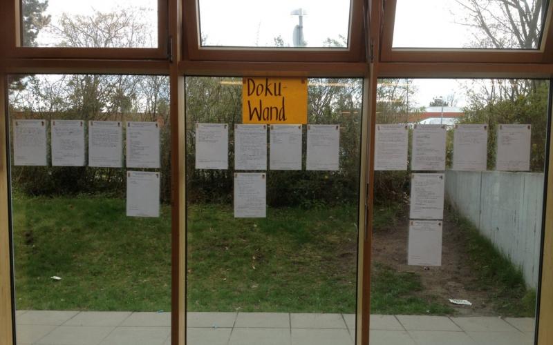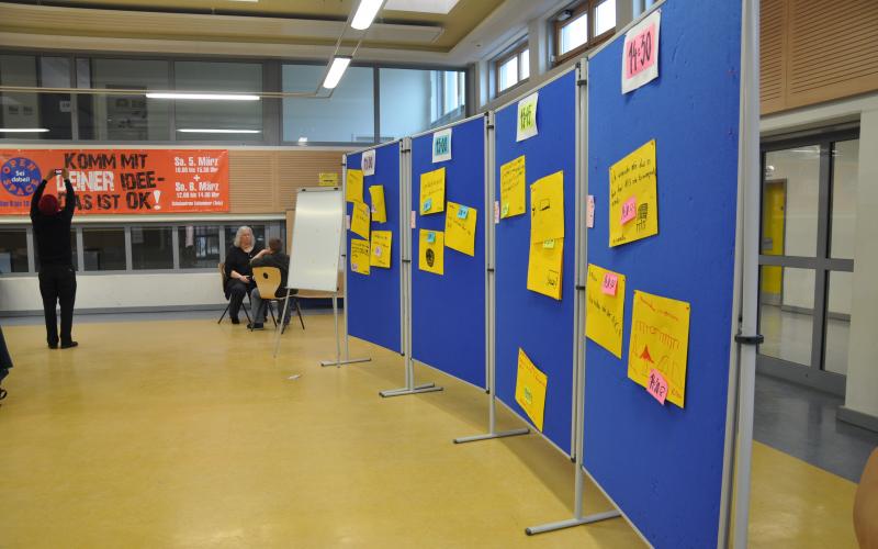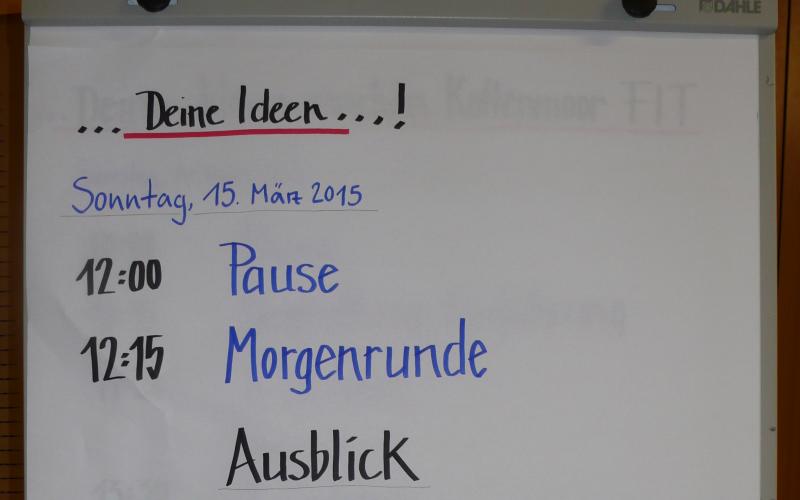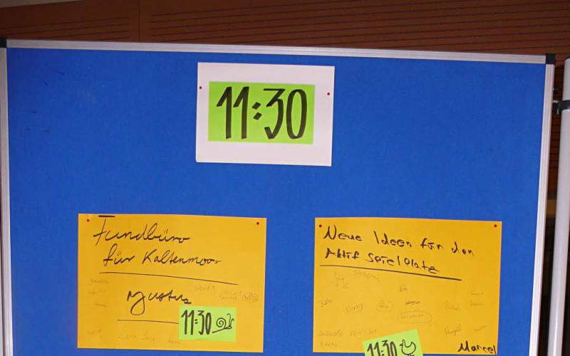 > Aufforderung zur Themensammlung. Jeder TN, der ein konkretes Thema vorträgt, schreibt es auf ein Blatt und bringt dieses an der Zeit- + Raumtafel an.Hier legt er „Raum + Zeit“ der Themenarbeit fest, wo +wann sich die Gruppe mit am Thema interessierten TN trifft.In der Gruppensitzung werden zu dem Thema Ideen, Maßnahmen + Ziele entwickelt. Die Gruppen halten ihre Arbeit in Protokollen fest, Aushang dieser an einer Nachrichtenwand.
