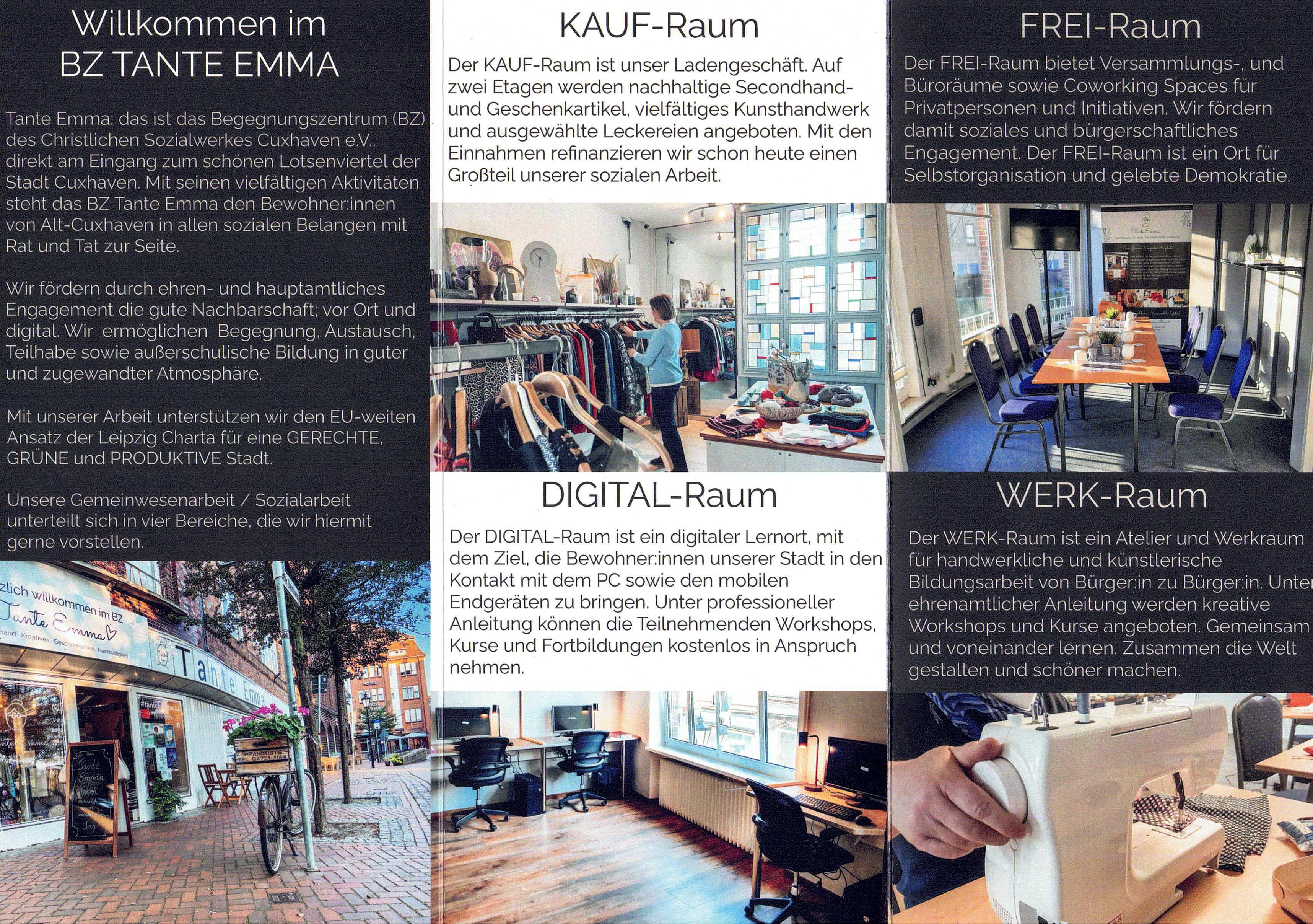 Nach dem Motto: „Nicht reden...machen!“ begann 2014 unsere Möbelhilfe für Geflüchtete, die Vereinsgründung erfolgte 2017. Die Zielgruppe wurde daraufhin auf alle Einwohner*innen (EW) erweitert. Durch die Verknüpfung von Ehren- und Hauptamt wurde zudem eine Basis für eine erste „zarte“ Gemeinwesenarbeit (GWA) im Innenstadtbereich gelegt. Durch die Kontakte in den Wohnungen der EW entstanden vertrauensvolle Beziehungen. Daraus ergaben sich Kenntnisse von weiteren Bedarfen u. Nöten auch anderer EW. Es wurden Angebote etabliert oder zu anderen Beratungsstellen weitervermittelt. Was neben der aufsuchenden Geh-Struktur aber fehlte, war ein Ort, wohin die EW dann auch kommen konnten. 2020 haben wir mit der Eröffnung des Begegnungszentrums (BZ) Tante Emma eine konkrete Anlaufstelle (Komm-Struktur) im Innenstadtbereich erschaffen. Dessen 5 Bereiche KAUF-, WERK-, FREI- und DIGITAL-Raum sowie unser Stadtteilbüro erfüllen jeweils eigene Funktionen, sind aber unmittelbar voneinander abhängig. (s.A.)