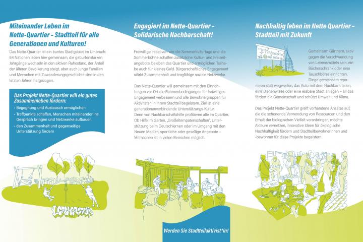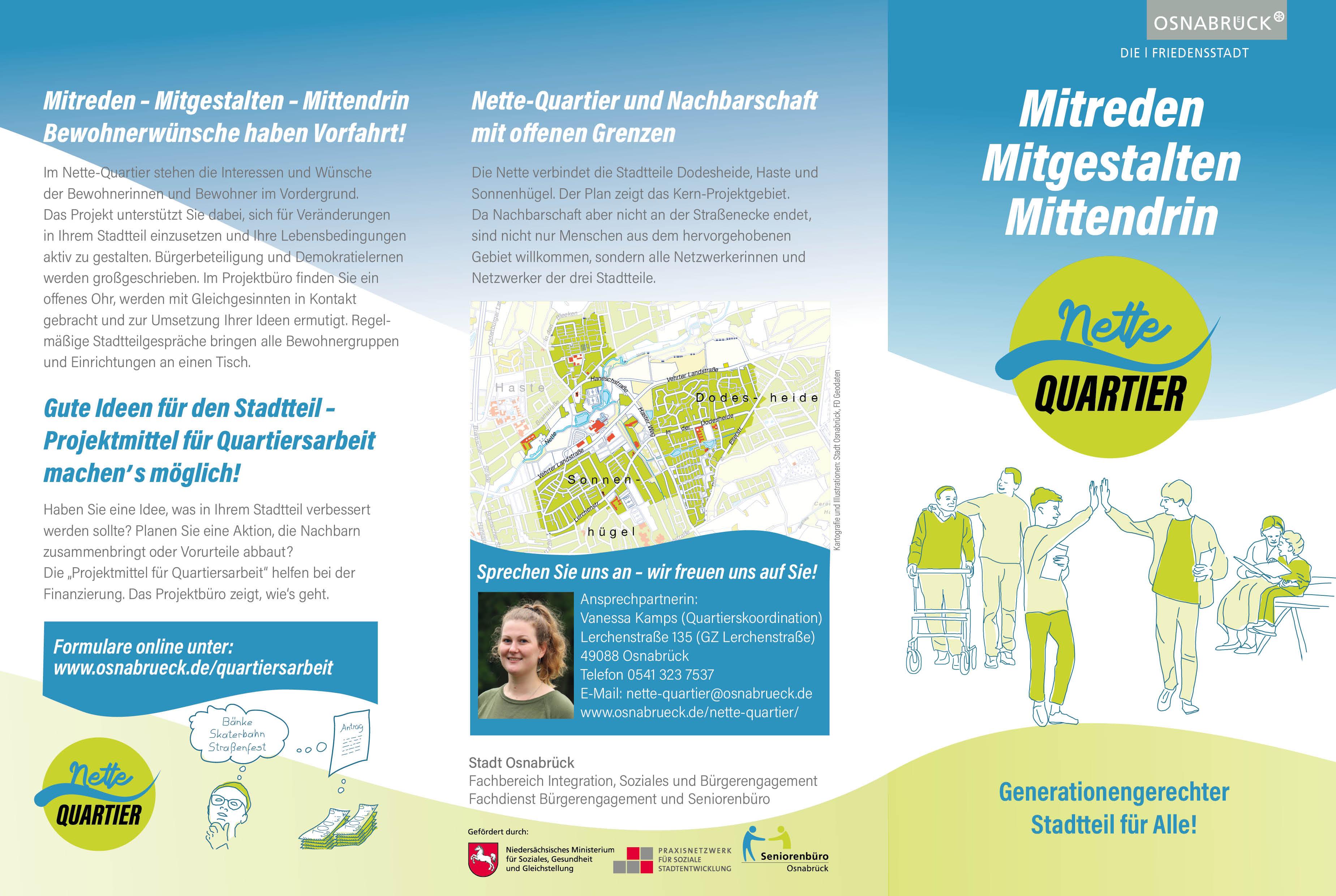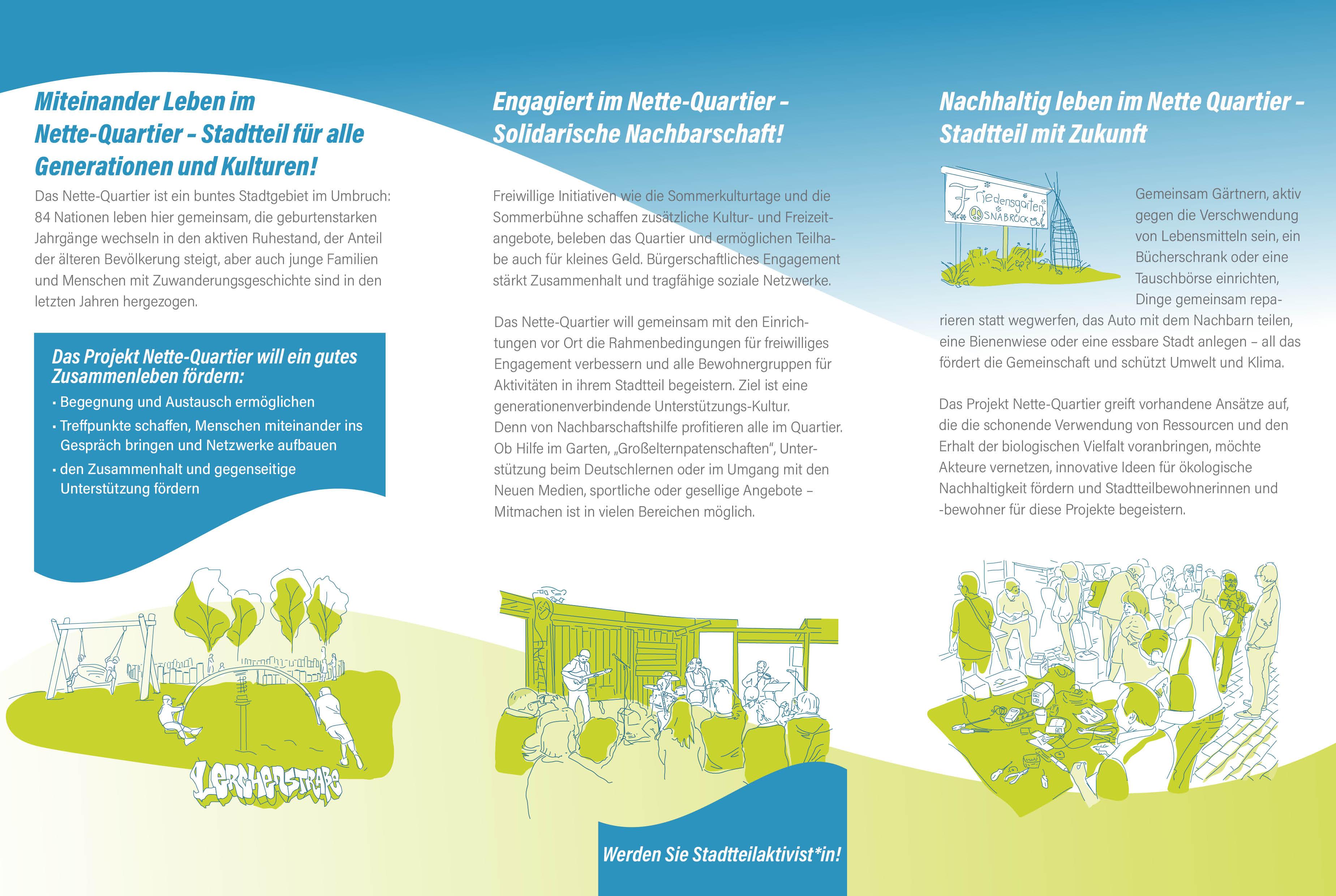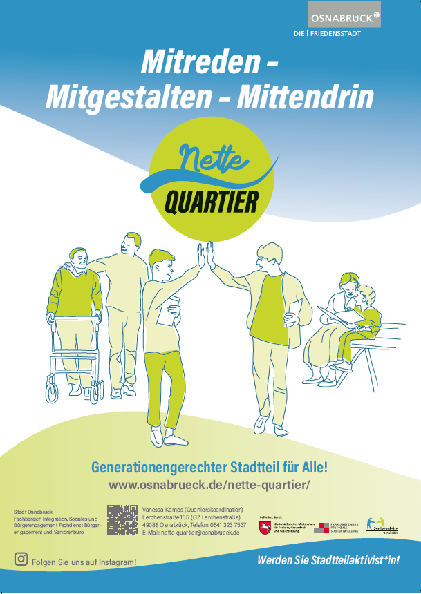 Im Nette-Quartier arbeiten die Fachbereiche „Kinder, Jugend, Familien“ und „Integration, Soziales, Bürgerengagement“ ressortübergreifend zusammen, um perspektivisch ein gesamtstädtisches Konzept der beteiligungsorientierten Quartiersentwicklung zu erarbeiten. Der Ansatz soll als gesamtstädtische Strategie der GWA/QM nutzbar gemacht und im Rahmen der Sozialplanung verstetigt werden. Mit der Projektförderung im Nette-Quartier hat die Stadt Osnabrück einen Pilotprozess zum integrativen Ansatz „Quartier für Alle!“ initiiert.