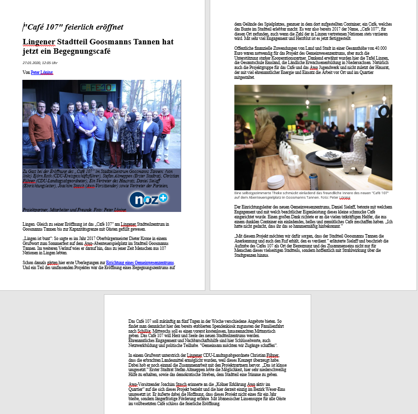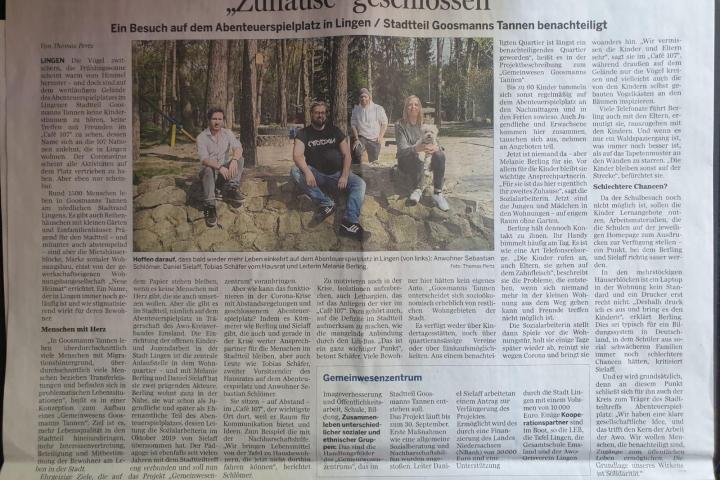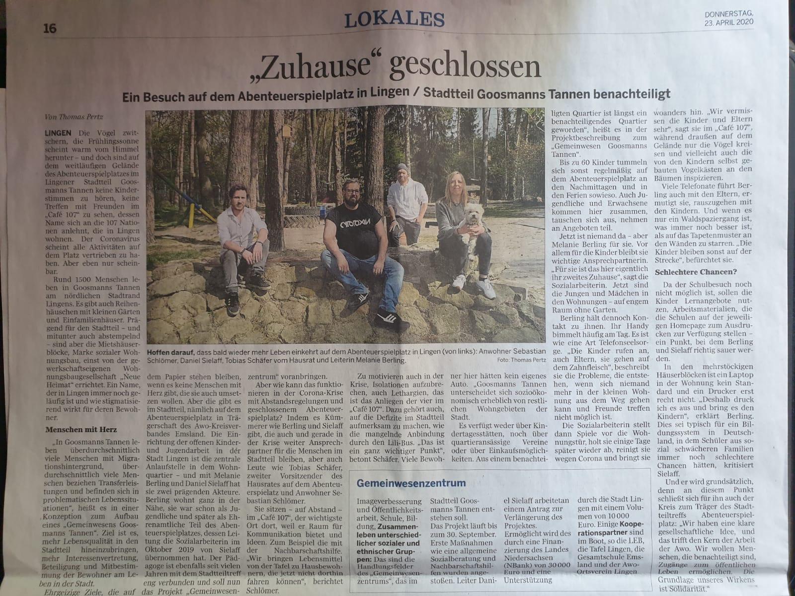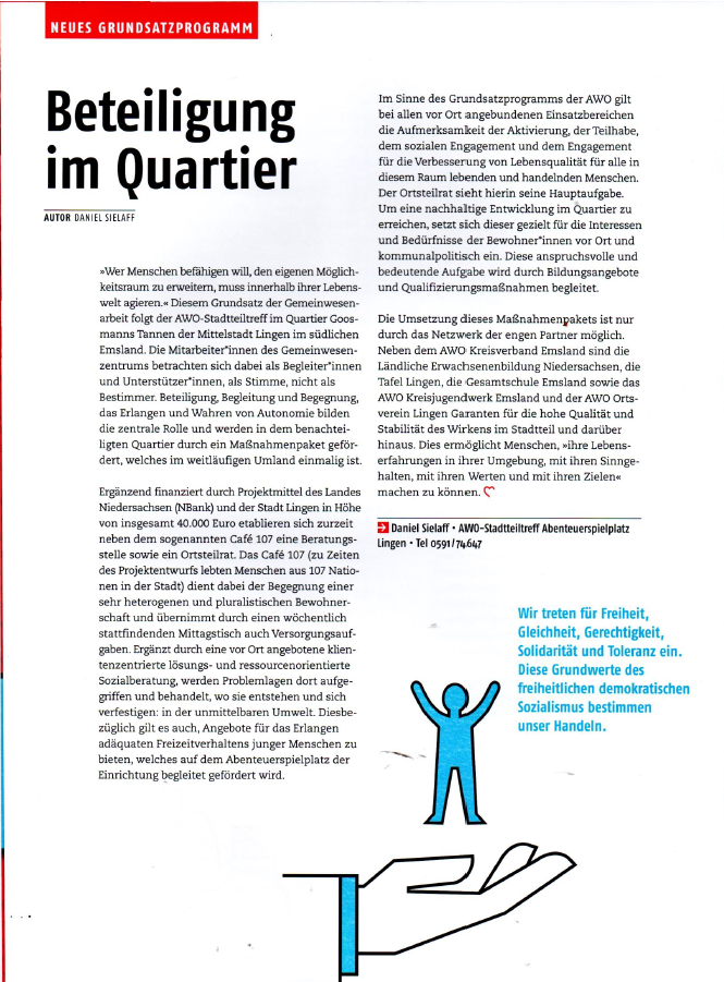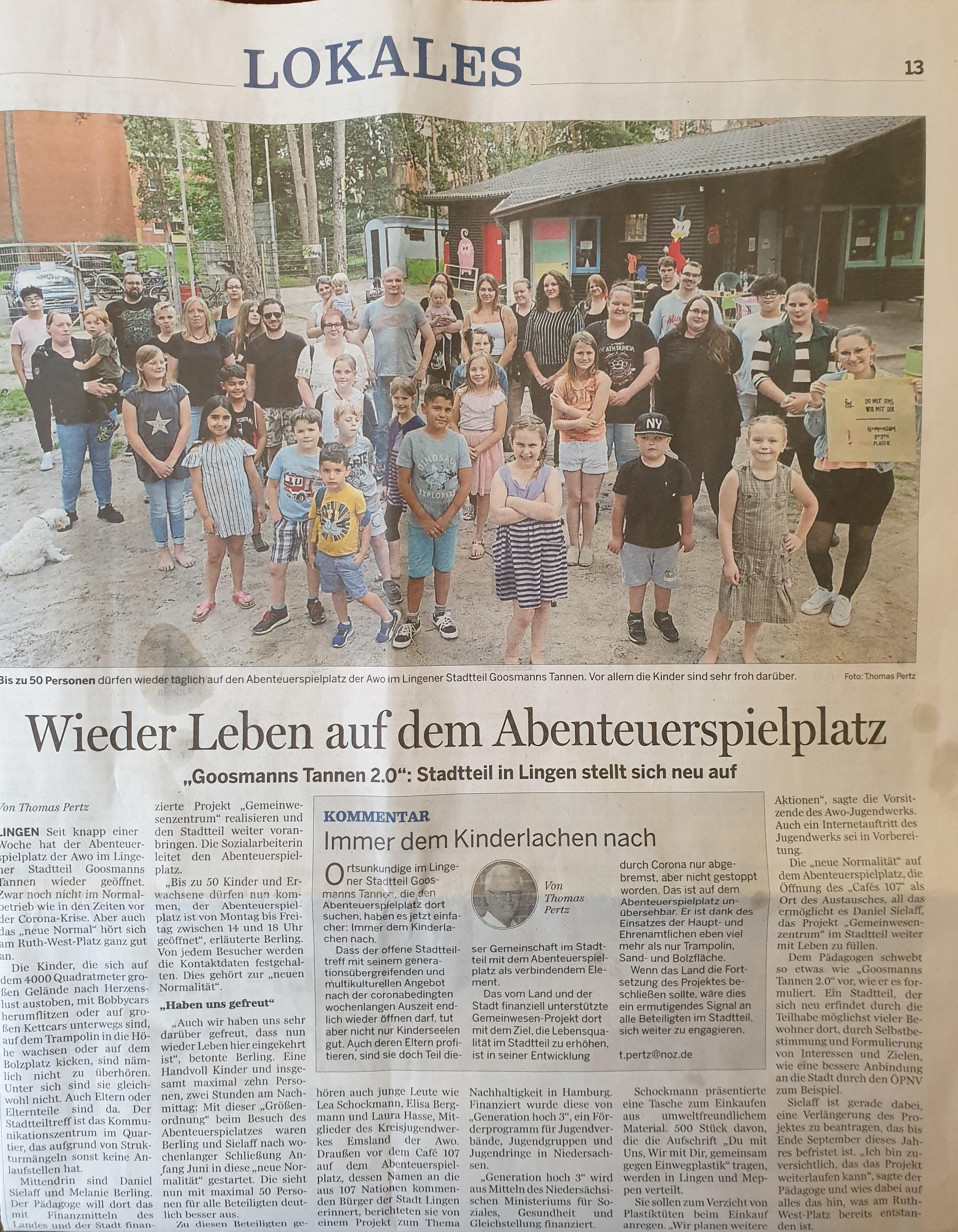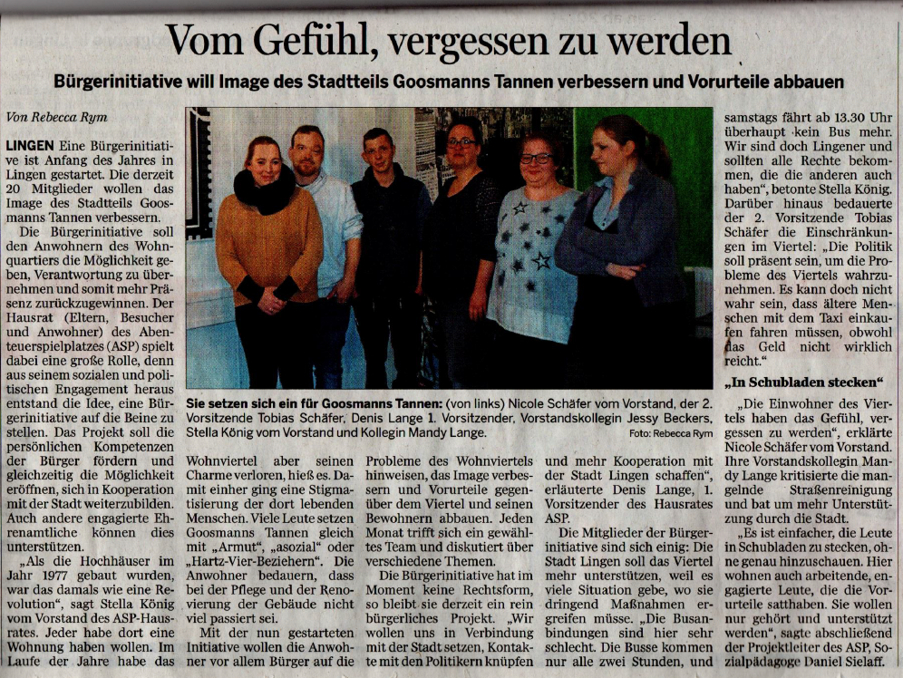 Das Quartier Goosmanns Tannen liegt am nördlichen Stadtrand der Mittelstadt Lingen mit ca. 1500 Bewohner*innen. Trotz Stadtrandlage mit hohem Grünflächenanteil ist die Qualität der Infrastruktur mangelhaft, das Stadtteilimage schlecht und benachteiligend. Die Projektinhalte und -methoden durchbrechen einen Prozess des sozialen und politischen Rückzugs und nehmen erheblichen Einfluss auf Autonomie, Selbstwert und Eigenmacht, erreichen durch Beteiligung, Begegnung und Begleitung Stärkung der Autonomie, so Verbesserung der individuellen und solidarischen Verantwortung. Der "Stadtteiltreff" wurde 1981 als Maßnahme der offenen Kinder- und Jugendarbeit in diesem Qurtier mit überdurchschnittlich hohem Anteil Sozialleistungsempfangenden und Zugewanderten errichtet und durch den Auftrag der Besucher*innen, ganzheitliche Unterstützung bei der Bewältigung der großteils prekären Lebenssituationen zu leisten, zu einem Zentrum stadtteilorientierter Sozialarbeit. 2019 schließlich konnte durch die Gewährung der städtischen und Landesfördermitteln die GWA offiziell als pädagogischer Schwerpunkt in das Konzept der Einrichtung eingebunden werden und bereits im ersten Jahr ein Begegnungscafè (Café 107), eine Beratungsstelle eingerichtet sowie eine Bürgerinitiative gegründet werden, welche durch Befragungen der Bürger*innen während einer Anwohner*innenversammlung Interessen und Bedarfe aufnehmen konnte und aus diesen bereits konkrete Zukunftsziele formuliert hat. So wird 2020/2021 Einfluss auf die Anbindung des ÖPNV genommen, welcher bisweilen das Wohnquartier nur stark begrenz anbindet, bzw. nicht berücksichtigt. Eine Vielzahl der Bewohner*innen sind aufgr. starker Mobilitätseinschränkungen von ext. Kontaktmöglichkeiten weitgehend abgeschnitten, nur wenige Familien verfügen über ein Fahrzeug. Auch die "Ver(sperr)müllung" des Quartiers bildet einen enormen Konfliktherd, welcher allgegenwärtig und schuldzuweisend wahrzunehnmen ist. Dabei ist zu betrachten, dass Straßenzüge des Quartiers weder als Abfuhrzone registriert sind, noch die Kapazitäten ausreichend sind. Durch ein Konzept in enger Zusammenarbeit (Anwohner*innen, Politik, Verwaltung) wird dieser Missstand überwunden und Bedarfe auf logistische Möglichk. abgestimmt. Zudem wird eine Stadtteil-App zur digitalen Vernetzung über Entwicklungen und Aktivitäten im Quartier aufklären und für alle Bewohner*innen im Stadtteil und darüber hinaus Kommunikationsplattform bilden und nachhaltig einen ganzheitlichen Zugang begünstigen.