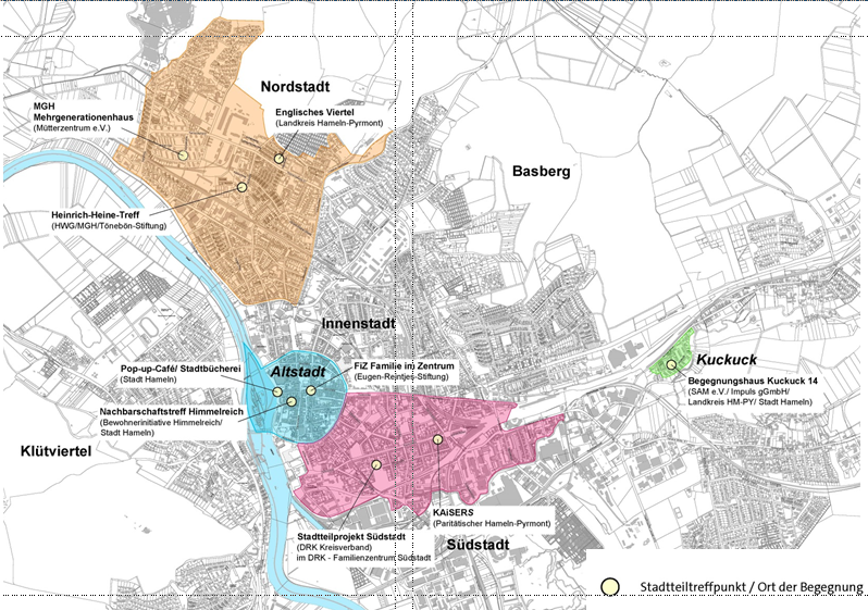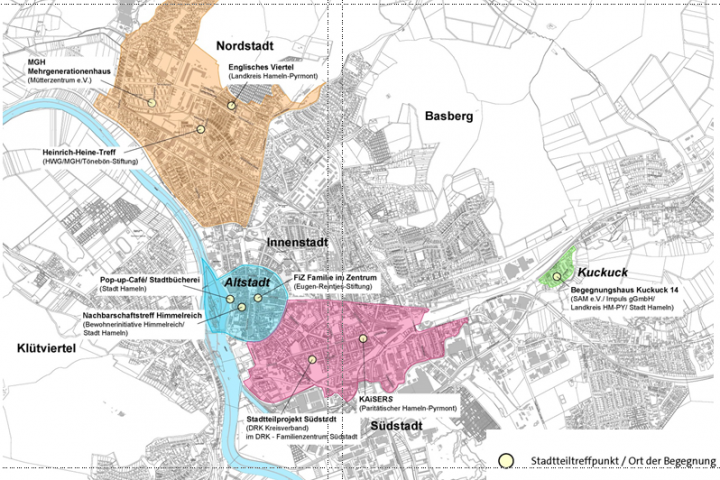 Kuckuck, Altstadt, Nordstadt und Südstadt gelten als Quartiere mit Entwicklungsbedarf und sind geprägt von Mängeln im Wohnumfeld, hoher Bebauungsdichte und fehlenden Freiräumen, aber auch von Verwahrlosung, (Kinder-)armut und hoher Zuwanderung. Die Coronakrise hat wie unter einem Brennglas Probleme sichtbarer gemacht und auch verschärft. Um innerstädtischen sozialen Schieflagen zu begegnen, hat die Stadt Hameln bereits seit 2017 eine Stelle zur Koordinierung der Quartiersentwicklung geschaffen. Zusätzlich wurde - finanziert über die Landesförderung - GWA in den Quartieren aufgebaut und als „Kümmerer vor Ort" mit dem klaren Auftrag der Bewohnerorientierung etabliert. Ende März 2021 endete die Projektlaufzeit. Der Wegfall von 1,5 Stellen für Gemeinwesenarbeit stellt einen großen Verlust für die Quartiere dar, vor allem entfällt auch der direkte Draht der Stadt Hameln zu den Bewohner:innen sowie viele Begegnungsmöglichkeiten. Um diese gravierende Lücke zu schließen, wird ein Verstetigungsprozess angeschoben, um Sozialraumorientierung in Hameln fortzusetzen und Stellen für GWA dauerhaft zu verankern. Mit der Landesförderung wird die Stadt Hameln die erforderlichen Strukturen aufbauen, um die dauerhafte Mitwirkung von Bewohner:innen an Stadtentwicklungsprozessen auf allen Ebenen zu etablieren und um diesen demokratischen Prozess im Anschluss aus eigenen Kräften zu verstetigen. Innerhalb der Verwaltung wird die ressortübergreifende Zusammenarbeit in den nächsten Jahren weiter ausgebaut werden. Hier setzt „Hameln kann’s zukunftswirksam“ an, damit auf allen Ebenen neue Formen des Miteinanders und eine neue Kommunikationskultur erprobt und letztlich selbstverständlich werden.
