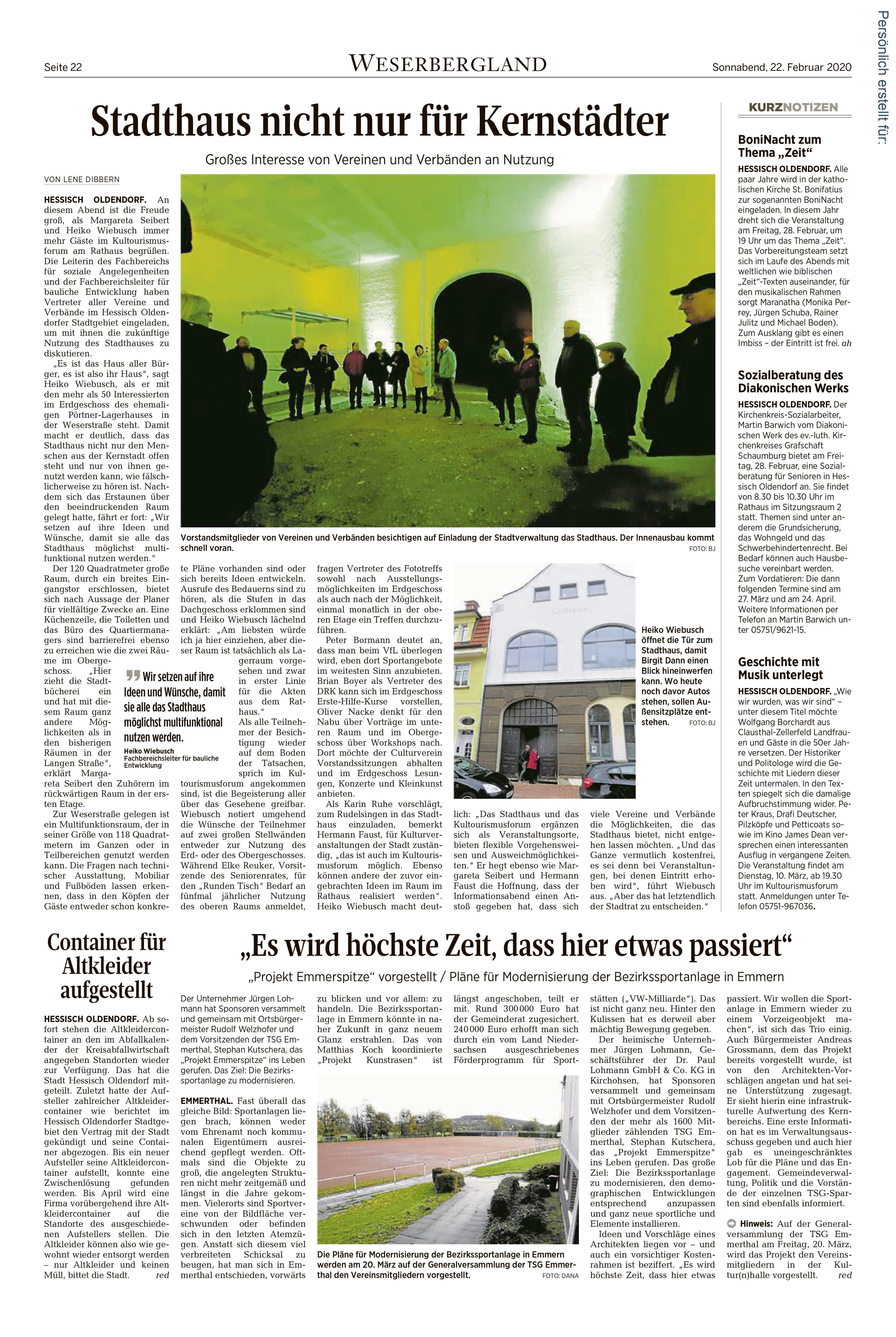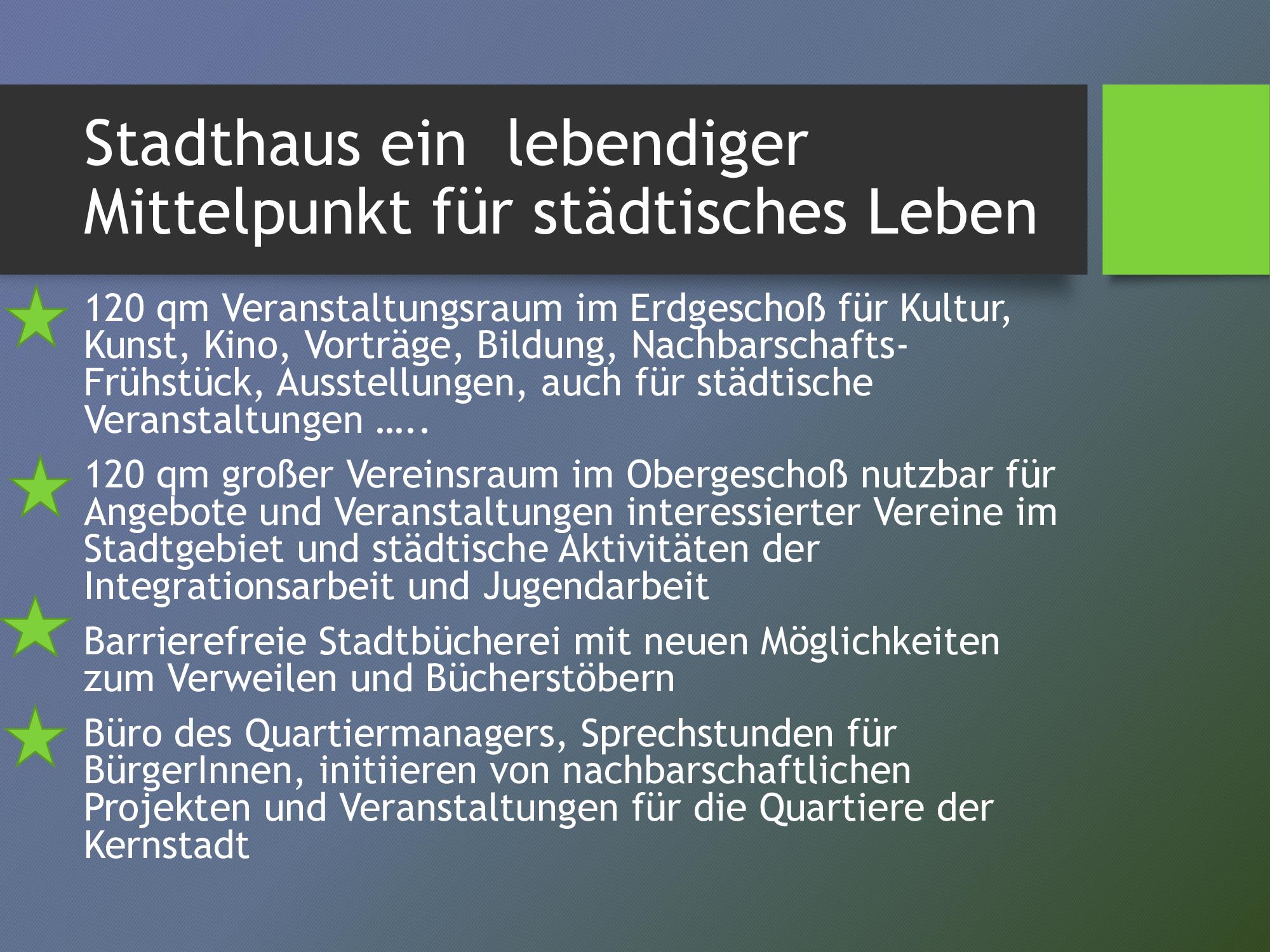 Die Stadt Hessisch Oldendorf, mit gut 18.000 Einwohnern gelegen im LK Hameln-Pyrmont sieht sich wie viele andere Orte ähnlicher Struktur, die nicht in unmittelbarer Nachbarschaft zu einem prosperierenden Oberzentrum liegen, mit verschiedenen Problemen der städtebaulichen Entwicklung konfrontiert. Insbesondere in ihrem grundzentralen Ort Hessisch Oldendorf werden diese manifest: Verlagerung von Handels- und Versorgungsfunktionen in Entwicklungsschwerpunkte außerhalb der Altstadt mit der Folge von Leerstand im ehemaligen zentralen Versorgungsbereich, Verfall historischer Bausubstanz, kein verfügbarer und den aktuellen Anforderungen entsprechender Bestand an Wohn- oder Gewerbeflächen, geringe Attraktivität wegen unzureichender kultureller oder sozialer Angebote, hohe Diversität in der Bevökerungsstruktur, viele Singlehaushalte, fehlende nachbarschaftliche Kontakte etc.In dem Bewusstsein, dass sich in den Zentren sozialer Zusammenhalt, ökologische Verträglichkeit, ökonomische Tragfähigkeit und kulturelle Innovation der Städte und Gemeinden entscheidet und die Zentren vielfältige Orte für Wirtschaft und Kultur, Orte zum Arbeiten und Wohnen, für Versorgung und Freizeit sind oder zumindest sein sollten, hat die Stadt Hessisch Oldendorf unter der Überschrift „Hessisch Oldendorf baut um“ eine städteplanerische Strategie zur Aufwertung der Innenstadt entwickelt und u.a. als Schlüsselimmobilie ein leerstehendes Lagerhaus revitalisiert, zum StadtHaus, als Begegnungsstätte für die Stadtgesellschaft und Standort für die Gemeinwesenarbeit umgebaut. Im Herz der Altsstadt, initiiert und koordiniert durch die GWA finden Vereine, Ehrenamt und Kultur einen neuen Ort des Zusammenhalts.