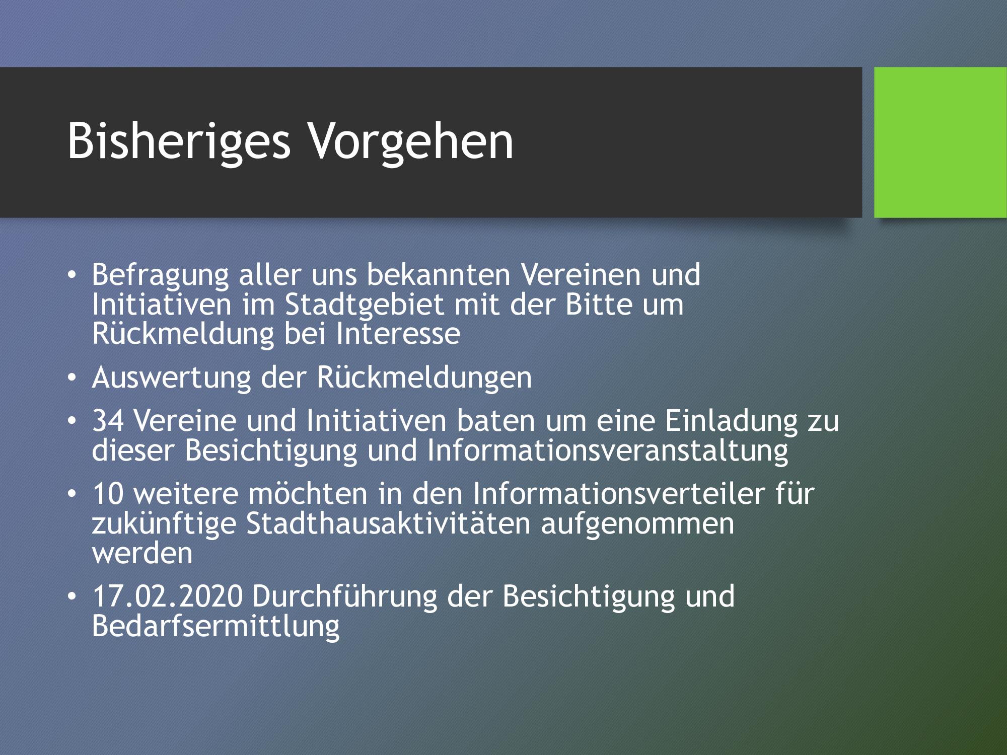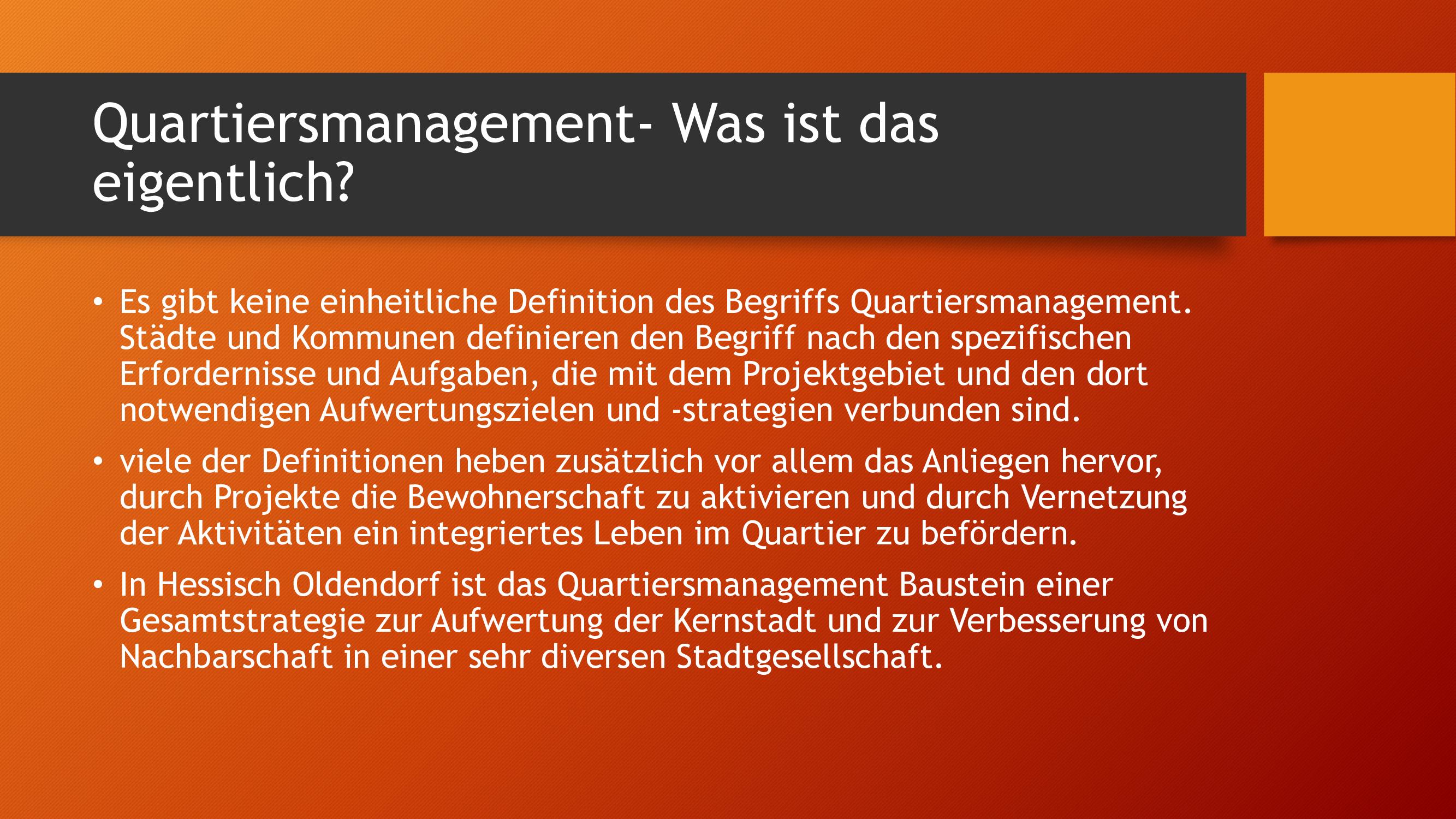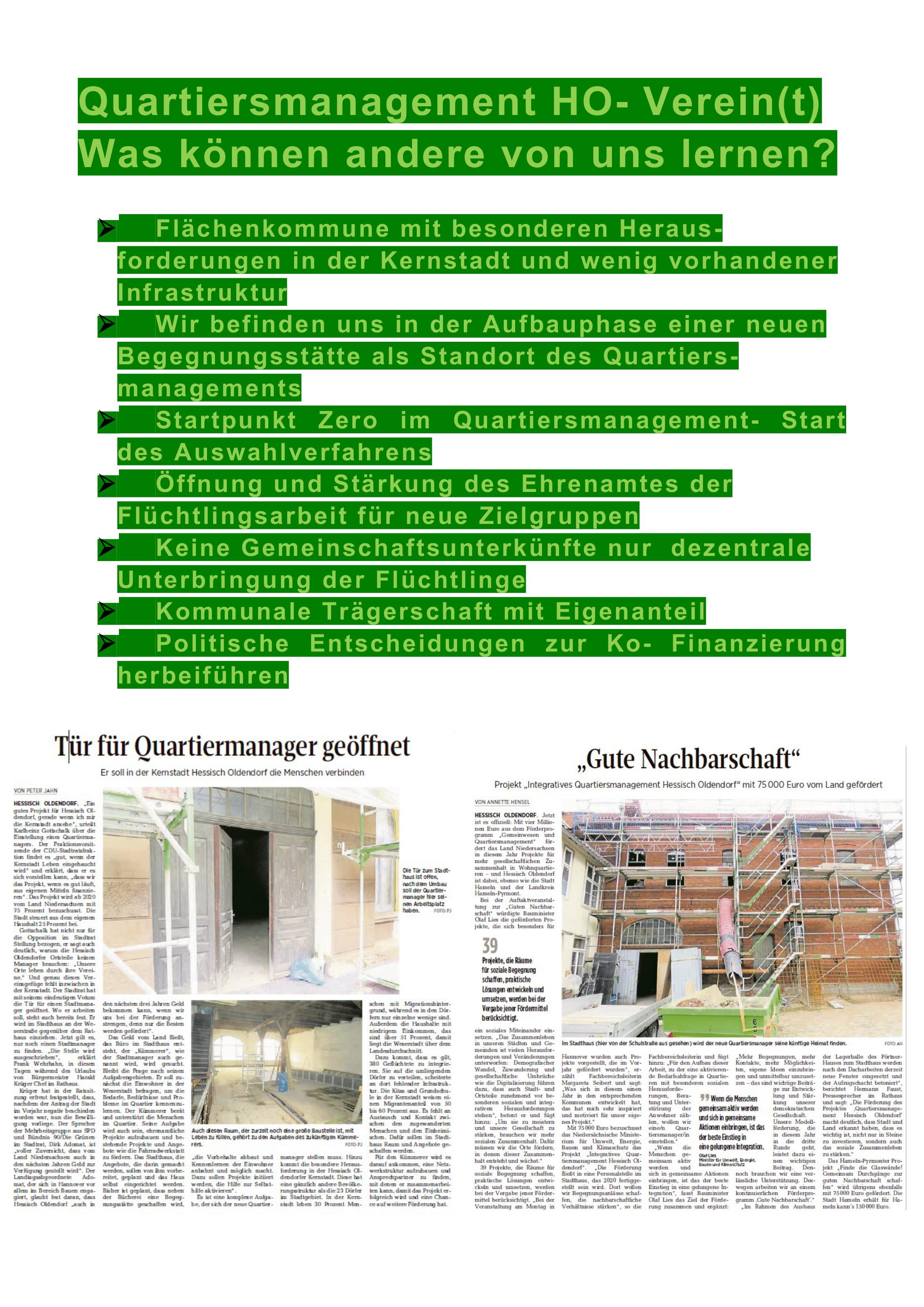 Der Aufbau der GWA ist ein Baustein der Gesamtstrategie HO - Baut um, die Wege aufzeigt, das Grundzentrum, in dem etwa 5.000 Menschen leben, langfristig als Identifikationsort der Gesellschaft und Kristallisationspunkt für das Alltagsleben zu erhalten. Das StadtHaus wurde mit EU-Fördermittel als Schlüsselimmobilie für städtische Daseinsfürsorge und als Standort u.a. für die Gemeinwesenarbeit umgebaut . Mit der Stelle des Quartiersmanager wird das StadtHaus mit Leben und Aktivität im Zusammenwirken mit den städtischen Vereinen, dem Ehrenamt und lokalen Akteuren erfüllt und für Kulturarbeit und Daseinsfürsorge entwickelt. Der Ort bietet Raum für das Beratungsbüro der Gemeinwesenarbeit,die Stadtbücherei, einen Versammlungsraum für das Vereinswesen, und einen Veranstaltungsraum für Kulturveranstaltungen und Begegnungsanlässe. Dabei ist unser QM der zentrale integrierende Faktor. Die GWA in Hessisch Oldendorf startete im Januar 2020 mit der Besetzung der Personalstelle. Die ersten Monate beinhalteten Konzeptentwicklung und Kontaktaufnahme zu potentiellen Vernetzungspartnern.Im Februar fand eine erste öffentliche Veranstaltung zum Thema GWA mit Stadthausbesichtigung statt, die auf eine breite Ressonanz stieß. 36 Vereine und weitere interessierte Bürger/innen bringen sich zukünftig mit Angeboten im StadtHauses ein. Die Liste der Kooperationspartner ist durch Öffentlichkeitsarbeit und Vernetzungsarbeit erfolgreich erweitert und daraus entstehen fortlaufend konkrete Mikroprojekte. Neue Projektideen werden auch aus der aktuellen Pandemiesituation heraus entwickelt und umgesetzt. So koordiniert der Quartiersmanager mit Ehrenamtlern Einkaufshilfen für Kranke und Bedürftige und ist in Kontakt zu Nachbarschaftsapps um ein digitales Medium aufzubauen. Der Quartiermanager hat viele offenen Türen vorgefunden und generiert stetig Kooperationsangebote. Er ist beteiligt an der Umsetzung des Gesundheit-Projektes 3000 Schritte, ist als Ehrenmitglied im Stadtmarketingverein mit regelmäßiger Teilnahme an den Vorstandssitzungen.Für die Zukunft erarbeitet das QM u.a.mit der Grünplanerin ein Konzept für Urban gardening, und unterstützt Zugewanderte bei Eintritt n die Erwerbsarbeit, bei Schwierigkeiten bei Beruf und Ausbildung werden sie durch das Eherenamt unterstützt. Einen besonderen Stellenwert nimmt die Vorbereitung der Nachhaltigkeit ein, regelmäßger Kontakt zu Politik, Stadtplanung und Wirtschaft soll die langfristige Sicherung der GWA herbeiführen.